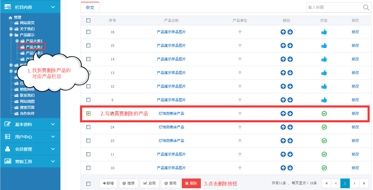 第二步:找到“产品展示”栏目,点开“产品展示”,我们会看到,有很多我们产品的分类列表,找到我们要删除的产品;