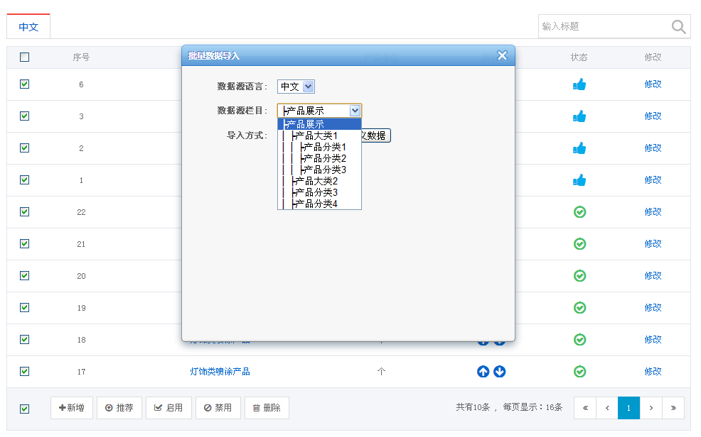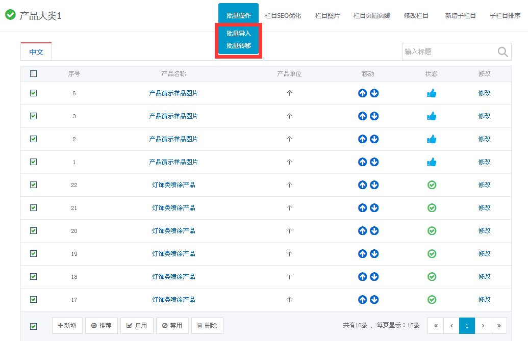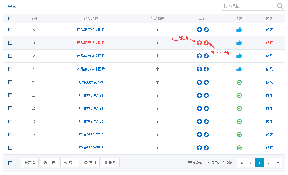 产品排序:产品栏目下的产品可以将按照需求进行上下移动,每移动一次就会向下或向上移动1位。