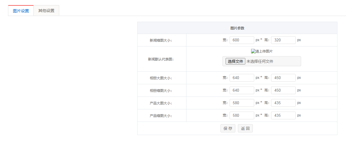 第二步:在图片参数中可以看到新闻,产品,图片分别对应大图,小图参数。在输入框填入对应的尺寸,再去上传图片即可;