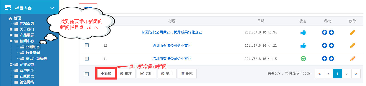 第二步:找到“新闻中心”栏目,找到后,确定你想要添加的新闻;如我们现在增加“公司动态”,那么,点击“行业新闻”,我们即可看到“公司动态”里面,已经添加的新闻列表;