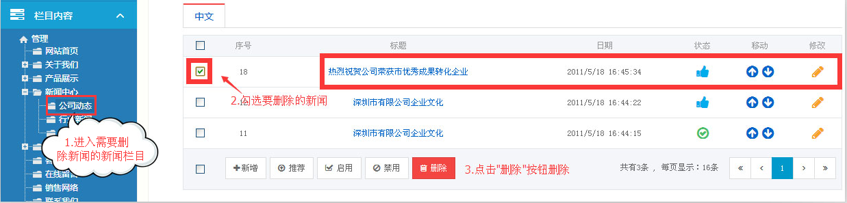 (注:将某一条新闻选择“删除“并点了“操作”后,此新闻将直接被删除掉,不可恢复,建议谨慎操作)