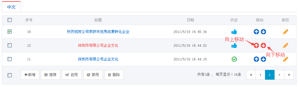 新闻排序:新闻栏目下的新闻可以将按照需求进行上下移动,每移动一次就会向下或向上移动1位。