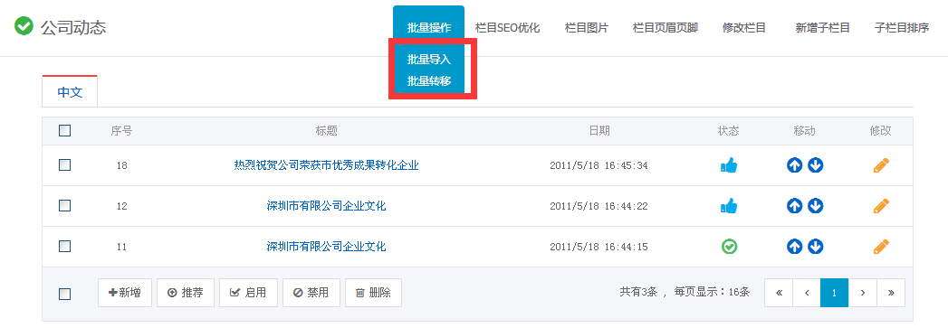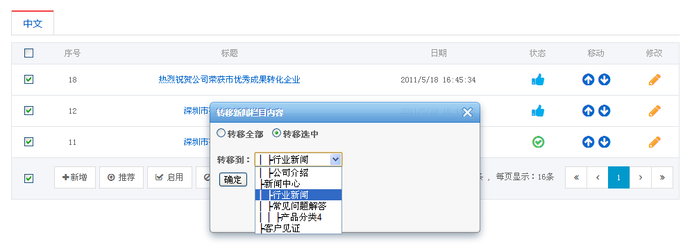 转移栏目:可以批量在新闻版块之间进行信息转移。转移方法如下。