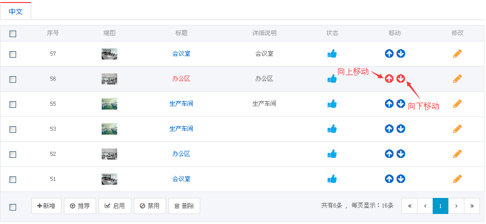 图片排序:图片栏目下的图片可以将按照需求进行上下移动,每移动一次就会向下或向上移动1位。