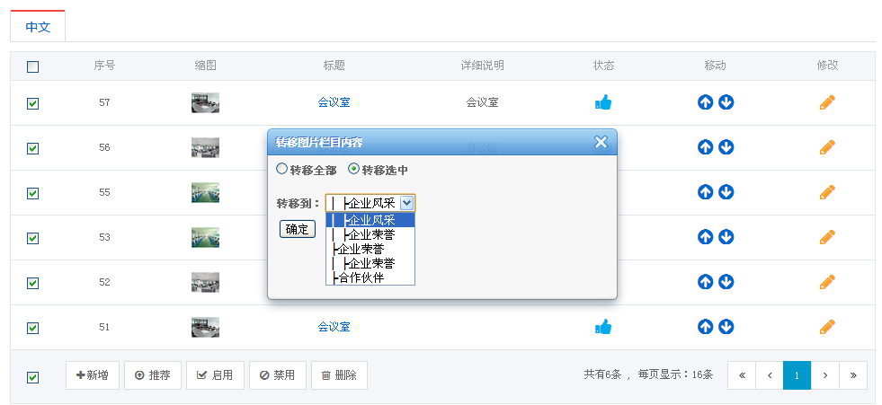 其中“转移全部”就是把该目录下所有内容都转移到指定栏目;“转移选中”就是把选择的内容转移到指定栏目中;“转移到”可以选择要转到的栏目,在要转移的内容后面勾选后即可。
