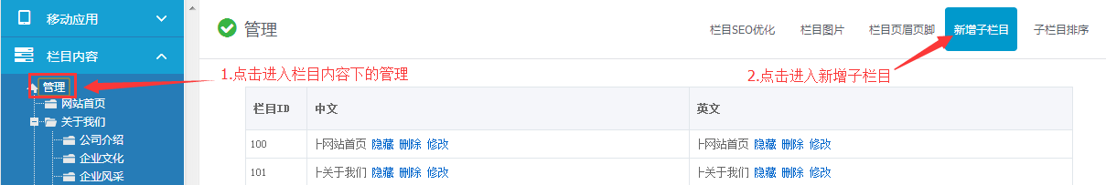 注:其他栏目新增子栏目的方法和此一样,但是,只有产品页面才支持3级栏目的建立,其余的页面只能新增2级栏目。