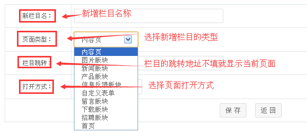 第四步:进入新增栏目界面后,添加新栏目的名字,栏目说明,栏目的类型,栏目跳转的页面;