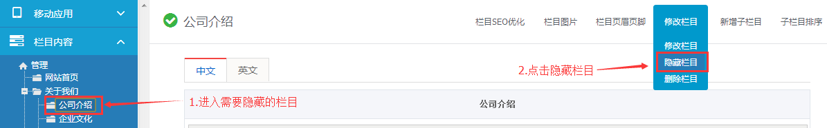 注:其他栏目隐藏栏目的方法和此一样,隐藏只是客户在我们网站上面是浏览不到这个栏目,但是,我们在后台是仍然能看得到的,只是在网站上面看不到而已;(隐藏不会删除栏目,只是暂时隐藏,网站上面看不到);如果要再次启用的话,进入隐藏界面选择不隐藏即可。
