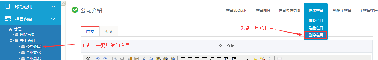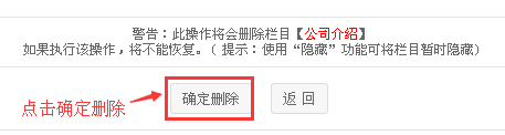 注:将某一栏目删除后,此栏目将直接被删除掉,不可恢复,建议谨慎操作