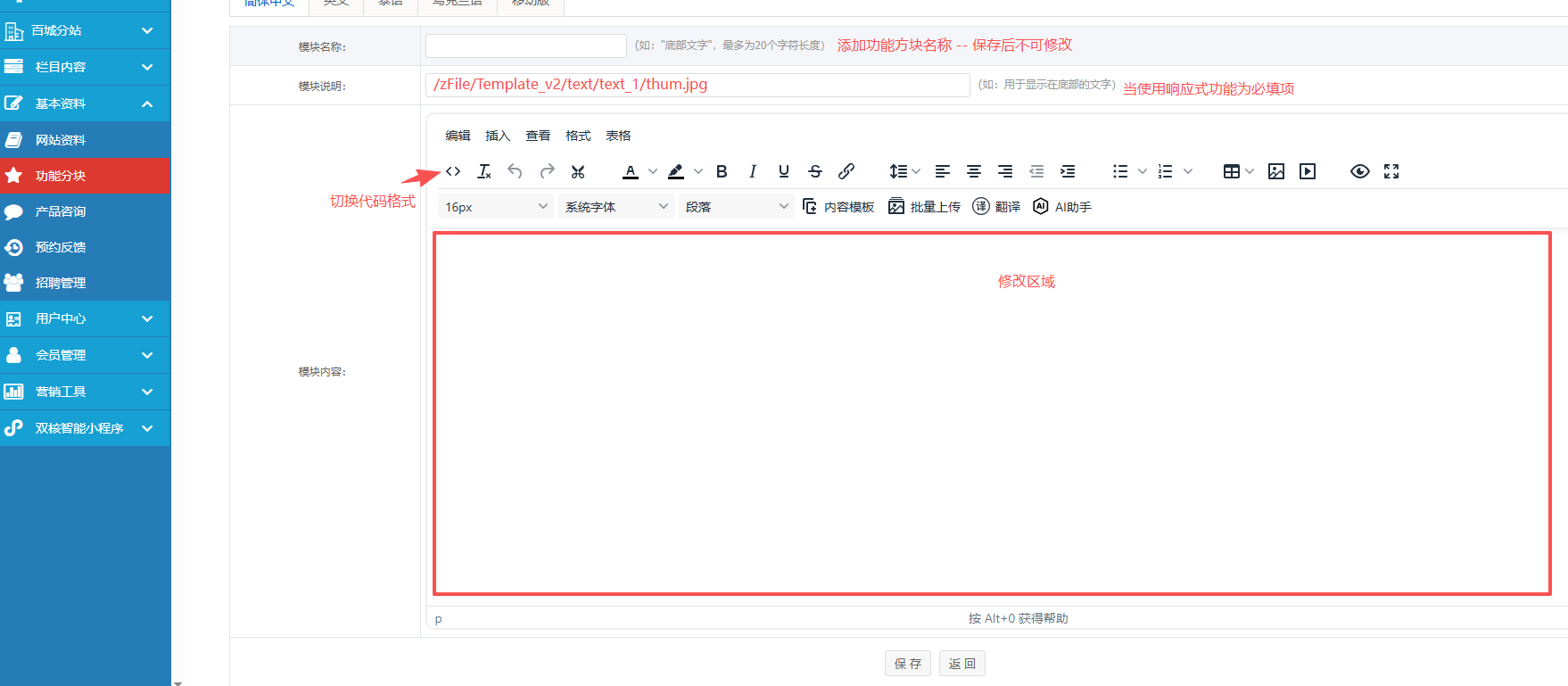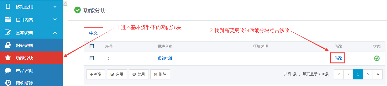 注:功能分块的禁用,删除,启用等功能与新闻的禁用,删除,一样操作。这里就不一一指出了。至于功能分块的新建和调用,这个可以联系网站开发人员来处理就可以了。
