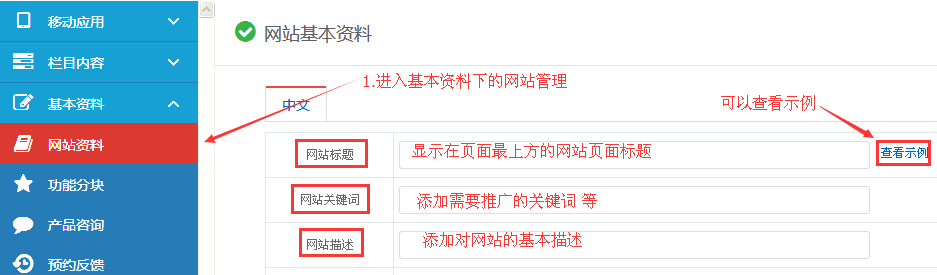 网站标题:此栏目出现于浏览器标题,一般可写公司名称,或者是产品名称(视优化的需要可自定);