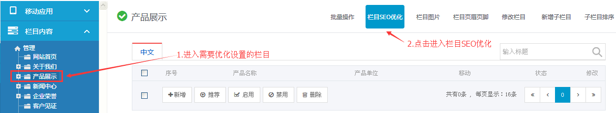 第二步:找到“产品展示”;第三步:点击“产品展示”在右侧界面有个“栏目SEO优化”。