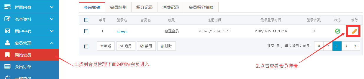 注:此功能必须开通会员系统,删除方法和删除留言的方法一样。