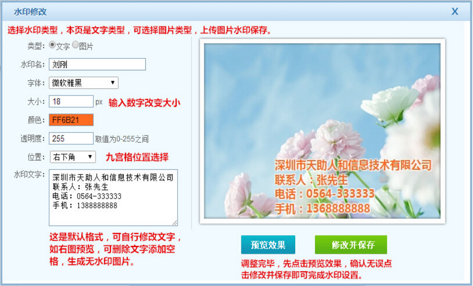 图片添加具体操作方法:先对图片进行水印设置,我们可把图片设置成文字和图片两种水印,文字水印较为简单,通过参数设置,设置好了,点击预览后保存即可。