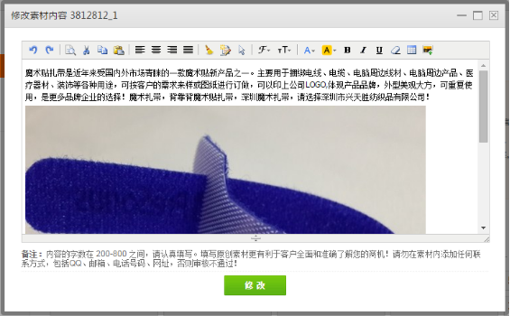 编写好素材后,我们要对素材信息进行增值加工——为素材信息添加图片。我们知道,图文并茂的素材,往往更能够吸引访问者的目光,可以为客户带来更多的流量和询盘。(图片水印功能参考2.1)当素材库出现特殊字符时,我们可以点击特殊格式(扫帚图标)消除按钮,以保证B2B平台商机信息的完整性。