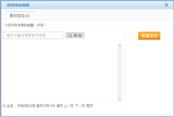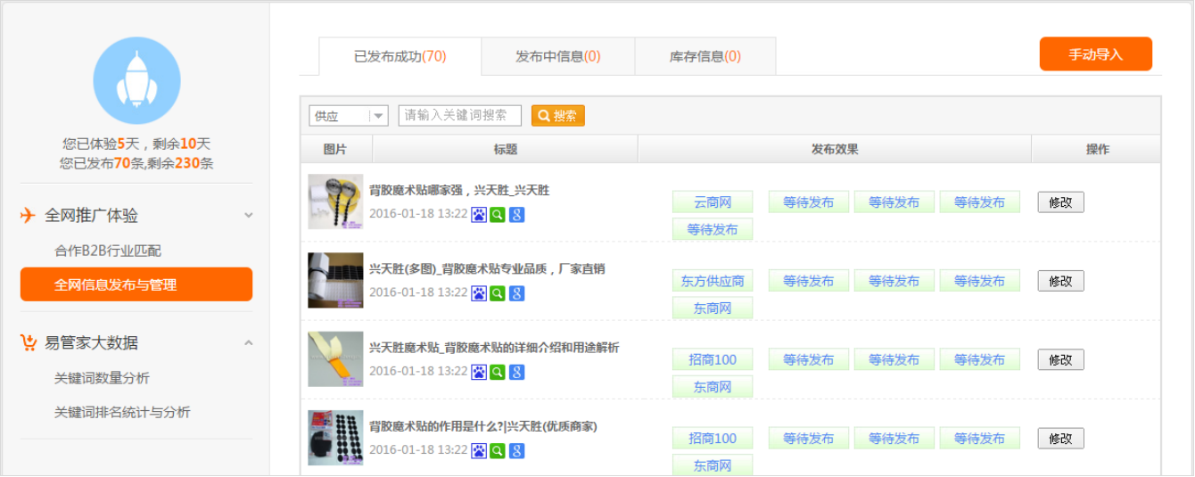 点击“手动导入”可将之前在批量创建的商机信息导入进行发布,每天50条*5倍发布,选择要发布的商机,点击“批量发布”就会自动发布到7家合作商盟网站。商机发布成功进入信息排队系统,24小时内发布。